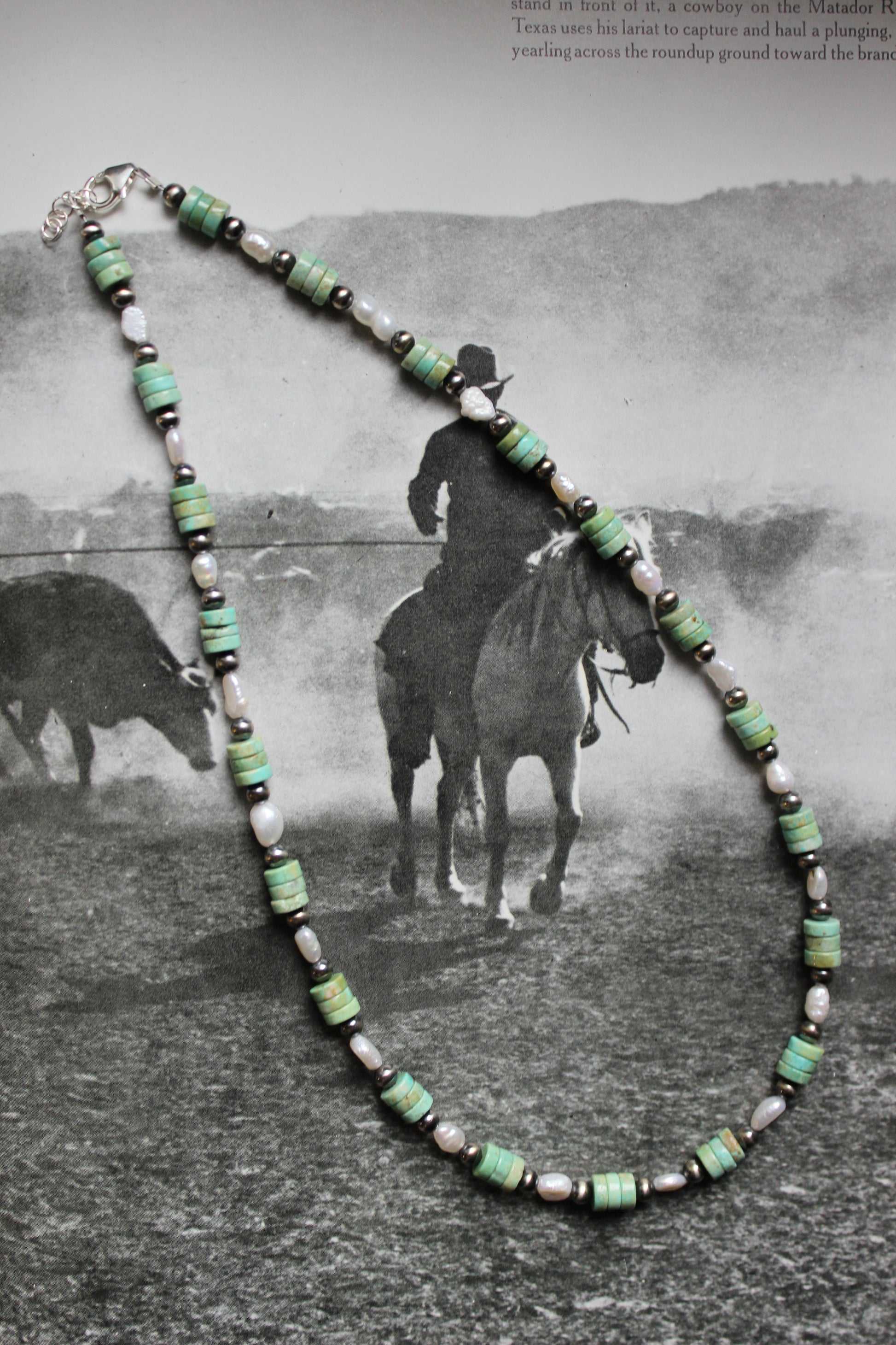 18 inch necklace with 4mm pearls, freshwater pearls, and green turquoise