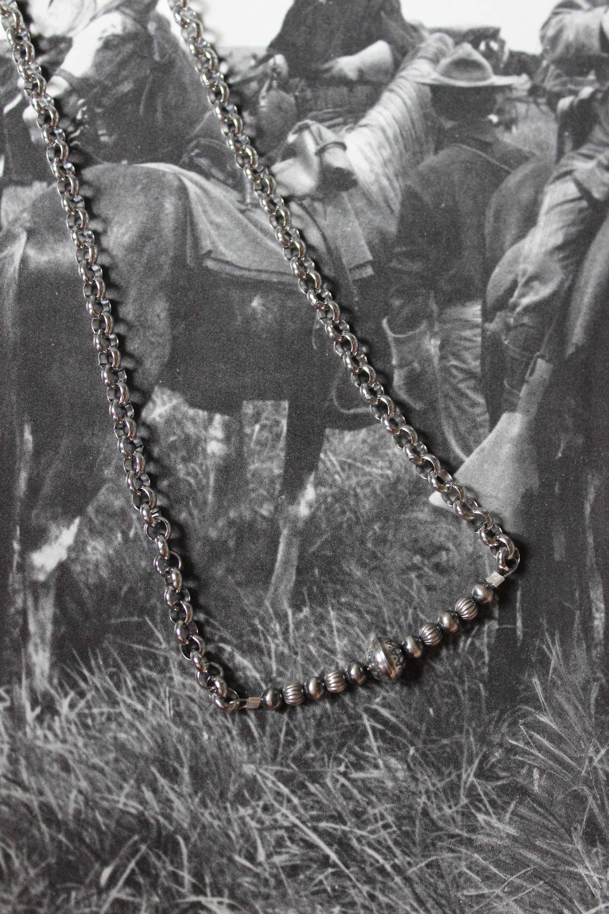 18 inch necklace with stainless steel rolo chain, assorted pearls, and a hand stamped pearl