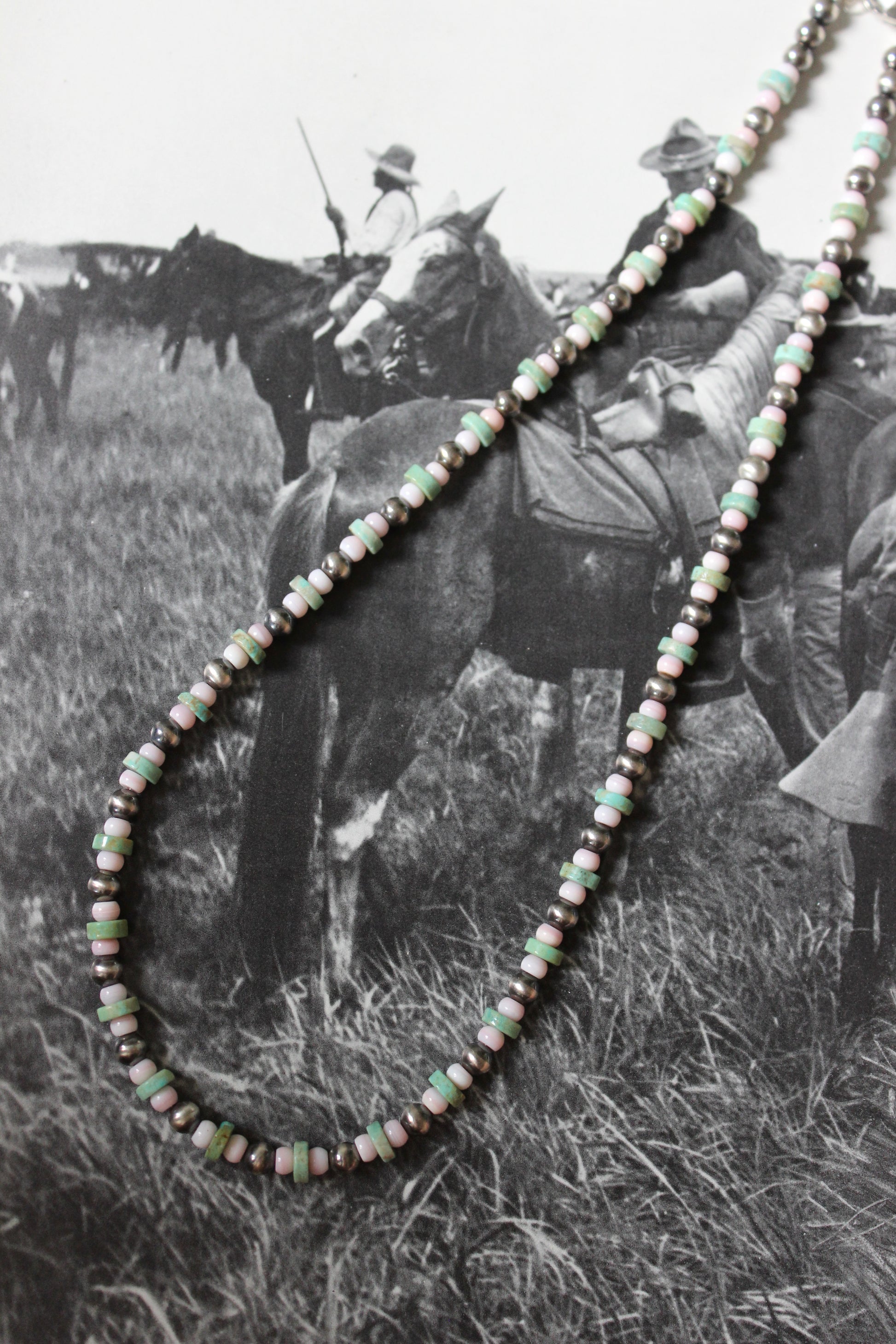 19 inch necklace with 5mm pearls, green turquoise, and pink conch